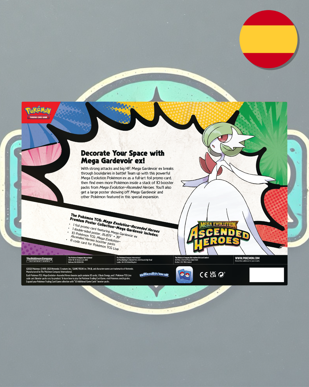 ¡Con ataques poderosos y muchos PS, Mega Lucario/Gardevoir ex atraviesa todos los límites en combate! Únete a uno de estos increíbles Pokémon ex de Mega Evolución en una carta promocional holográfica de arte completo, y luego encuentra aún más Pokémon dentro de una pila de 10 sobres de mejora de Mega Evolución—Héroes Ascendidos. También recibirás un póster grande que muestra a Mega Lucario/Gardevoir y otros Pokémon destacados en esta expansión especial.