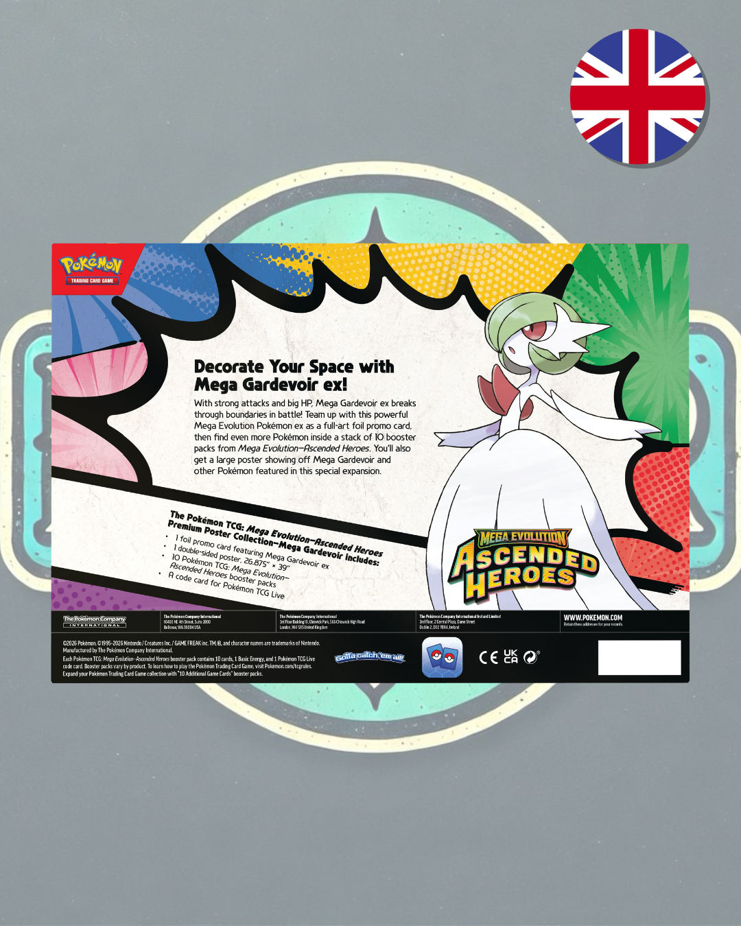¡Con ataques poderosos y muchos PS, Mega Lucario/Gardevoir ex atraviesa todos los límites en combate! Únete a uno de estos increíbles Pokémon ex de Mega Evolución en una carta promocional holográfica de arte completo, y luego encuentra aún más Pokémon dentro de una pila de 10 sobres de mejora de Mega Evolución—Héroes Ascendidos. También recibirás un póster grande que muestra a Mega Lucario/Gardevoir y otros Pokémon destacados en esta expansión especial.